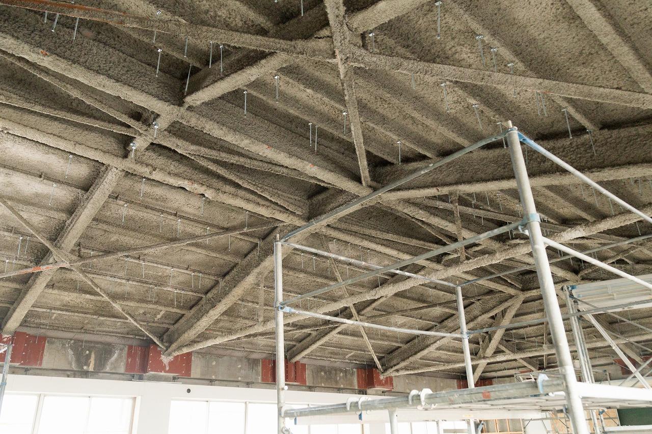 火災の熱から鉄骨の柱や梁を守るために、耐火・断熱性の高い材料を鉄骨に吹き付ける工事です。